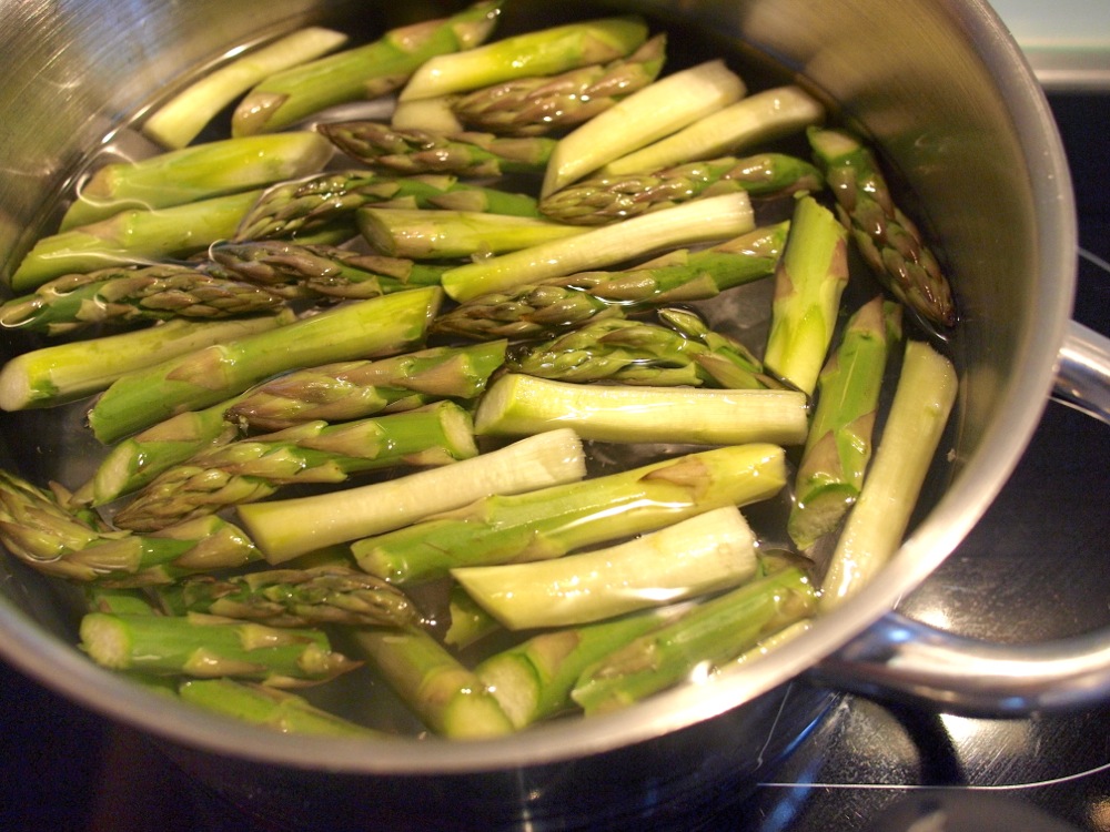 Vom Spargel die holzigen Enden entfernen. Den weißen Spargel schälen, den grünen Spargel nur im unteren Drittel, anschließend schräg in ca. einem halben Zentimeter dicke Scheiben schneiden. Beide Spargelsorten in sehr kräftig gewürztem Salz-Zucker-Wasser bissfest kochen, abschrecken, abtropfen lassen und die Safran-Vanille-Vinaigrette vorsichtig untermischen.