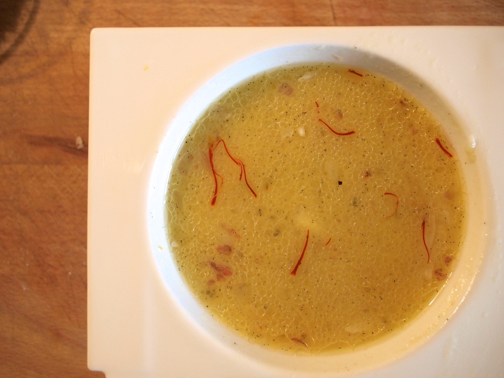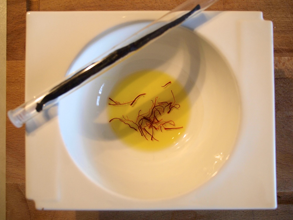 Safran in einem Esslöffel heißem Wasser gut zehn Minuten einweichen lassen. Die Schalotten fein würfeln. Brühe mit Essig und Senf in einer Schüssel verrühren, mit Chillisalz und einer Prise Zucker würzen. Öl, Schalotten, Safran und Vanillemark unterrühren.